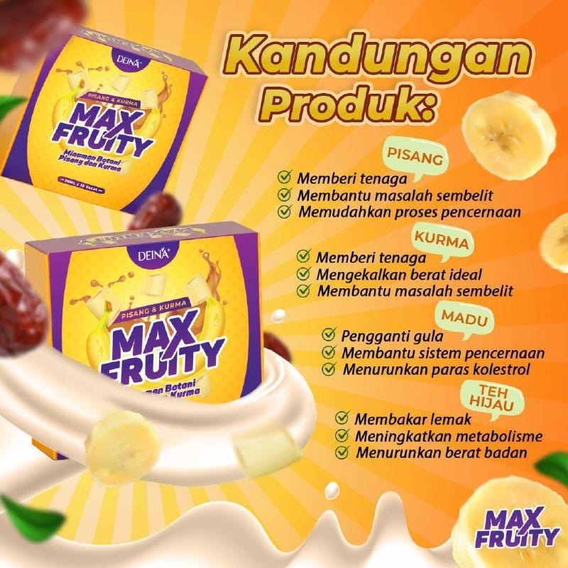 Extract Bahan Semula Jadi MAX FRUITY iaitu PISANG, MADU DAN KURMA yang terbukti berkesan boleh bantu clearkan usus dan membantu mengurangkan masalah SEMBELIT anda seawal 7 hari penggunaan.